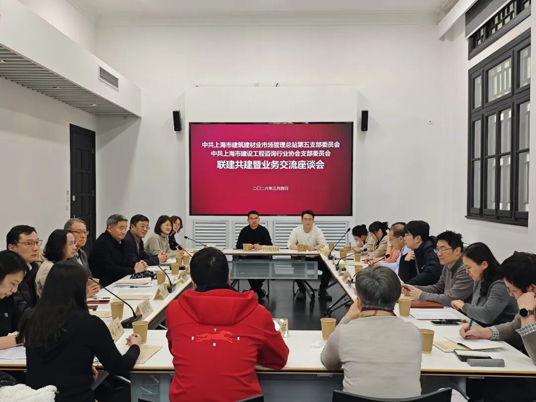为深入推进党建与业务深度融合,搭建政企沟通协作平台,凝聚行业发展合力,3月4日下午,上海市建筑建材业市场管理总站第五党支部与上海市建设工程咨询行业协会党支部联合举办联建共建暨业务交流座谈会。上海市建筑建材业市场管理总站党委委员、副站长钱智勇,第五党支部书记、定额管理科科长康元鸣,第五党支部副书记、造价管理科科长彭磊,建筑产业现代化推进科副科长王晶磊,上海市建设工程咨询行业协会常务副会长张强,党支部书记曹朔,副会长朱坚、金菁,青联会主席顾晓辉,青联会副主席罗洋静,以及双方党支部党员、相关业务骨干参加会议。会议由协会秘书长徐逢治主持。