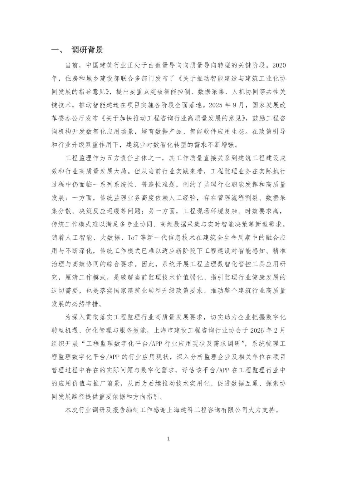 目前,调研已圆满完成,并编制完成《工程监理数字化平台/ APP行业应用现状及需求调研报告》,特此推送分享,欢迎查阅参考。